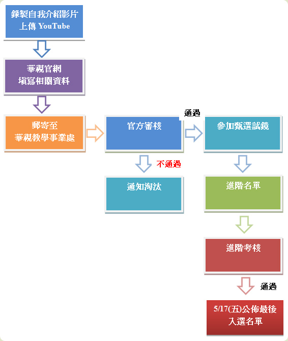 5/17(五) 華視將邀請所有試鏡甄選入圍者,參加「第一屆全國傳播院校畢業作品武林大會」,現場除頒發入圍證書外,並將公佈最後入選名單。 |